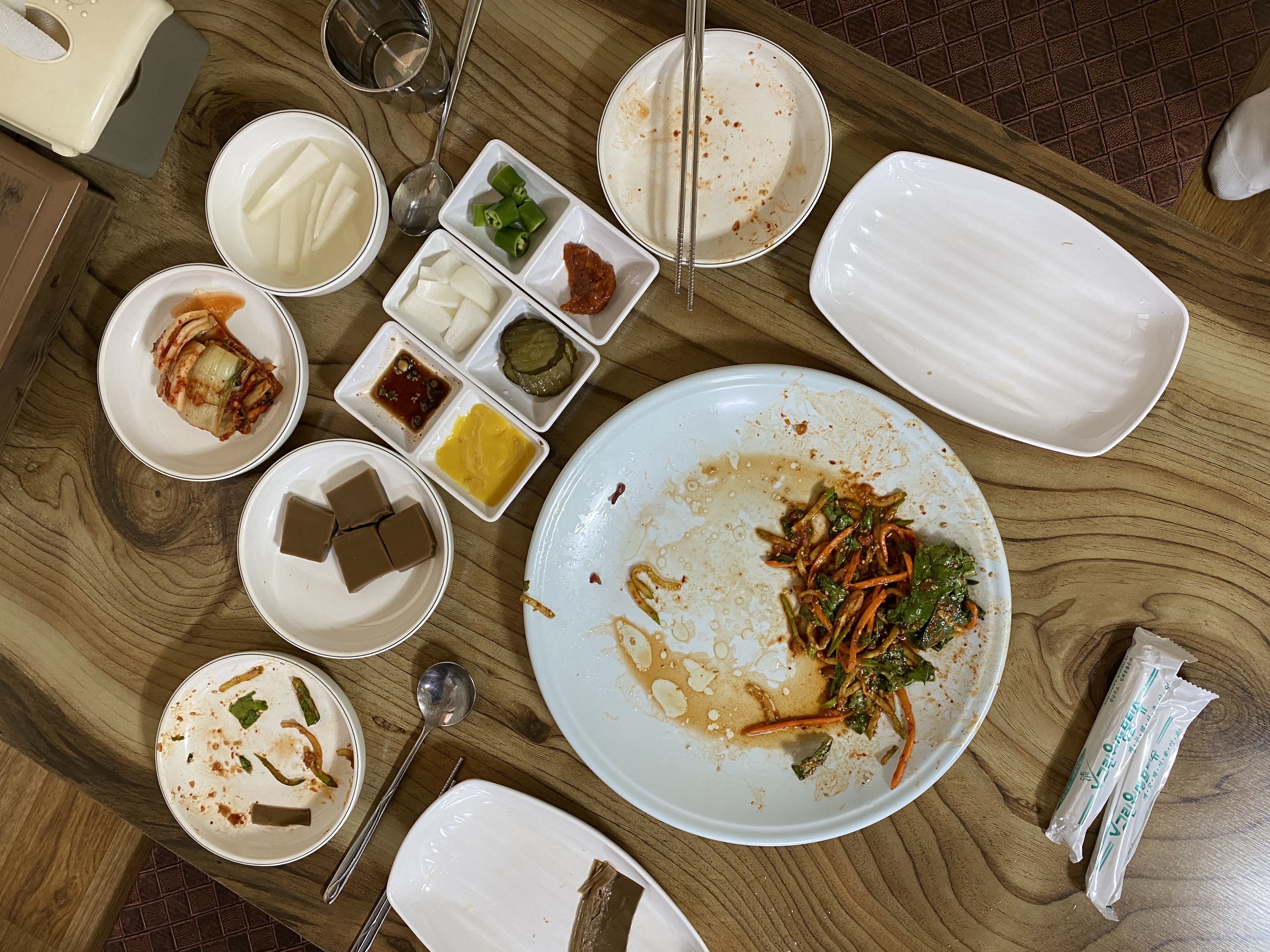 반찬은 피클, 도토리묵, 묵쌈, 김치, 동치미 등등~